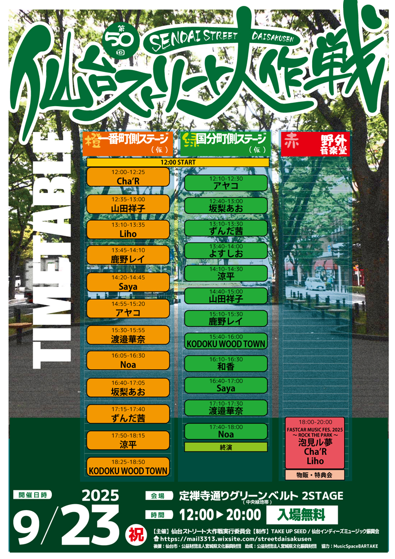 [時間] 【野外音楽堂】start 18:00~ [料金] 入場無料 [応援投げ銭] https://x.gd/fastcar250923 [問い合わせ] https://mail3313.wixsite.com/streetdaisakusen |
