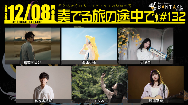 [時間] open 18:00 / start 18:30 [観覧料金] 早割¥2500(1drink付) / 一般¥2500(+1drink別¥500) / 高校生以下¥1000(+1drink別¥500) ※早割は公演1週間前までのWEB予約が対象です。 [配信料金] リアルタイム視聴無料(ツイキャス) / アーカイブ視聴¥1000 [観覧予約・応援チケット] https://x.gd/bartake251208 [配信] ツイキャス https://twitcasting.tv/sendaibartake |