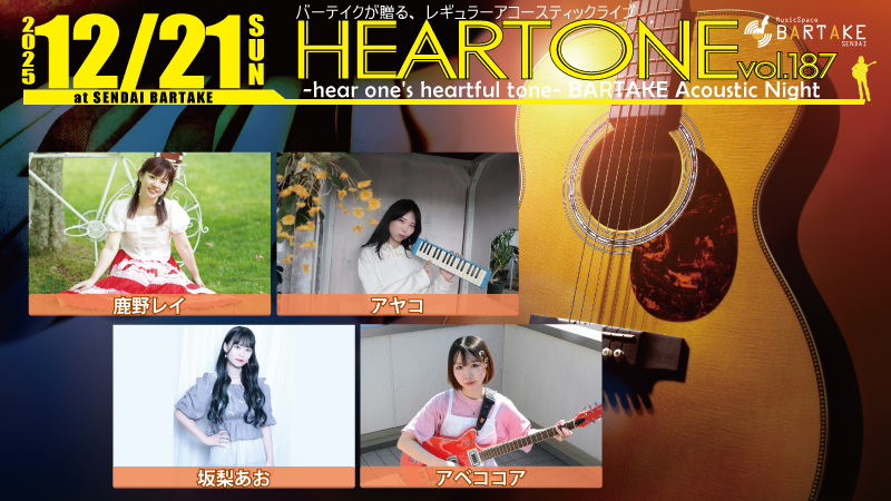 [時間] open 11:50 / start 12:10 [観覧料金] 一般¥2500(+1drink別¥500) / 高校生以下¥1000(+1drink別¥500) WEB早割:アーカイブ視聴券付き(1週間前までのWEB予約分対象) [配信料金] リアルタイム視聴無料(ツイキャス) / アーカイブ視聴¥1000 [観覧予約・応援チケット] https://x.gd/bartake251221 [配信] ツイキャス https://twitcasting.tv/sendaibartake |