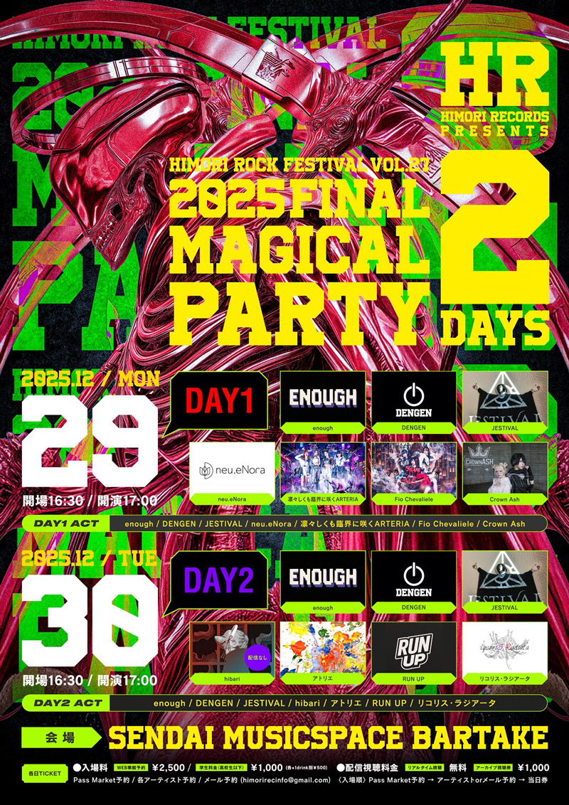 【Himori Rock Festival vol.27 「2025FINAL MAGICAL PARTY DAY2」】[出演] ■ENOUGH ■DENGEN ■JESTIVAL ■hibari ■アトリエ ■RUN UP ■リコリス・ラジアータ |