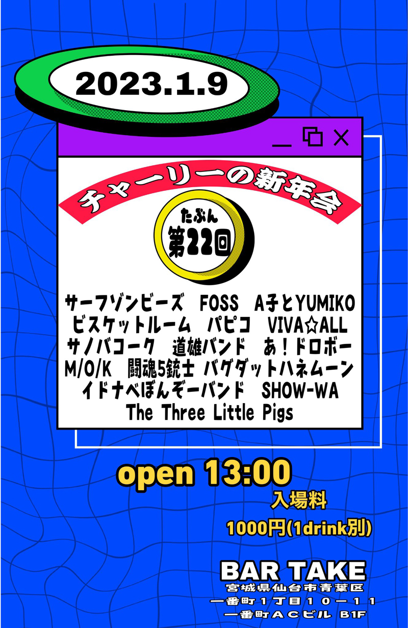 【チャーリーの新年会】[出演] ■サーフゾンビーズ ■FOSS ■A子とYUMIKO ■ビスケットルーム ■パピコ ■viva☆all ■サノバコーク ■道雄バンド ■あ!ドロボー ■闘魂五銃士 ■イドナベぼんぞーバンド ■バグダットハネムーン ■M/O/K ■SHOW-WA ■The Three little pigs |