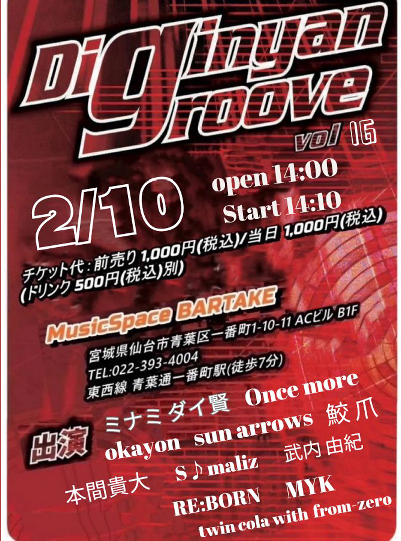 【Diginyan groove vol.16】[出演] ■ミナミダイ賢 ■Once more ■okayon ■sun arrows ■鮫爪 ■本間貴大 ■S♪maliz ■武内由紀 ■RE:BORN ■MYK ■twin cola with from-zero |
