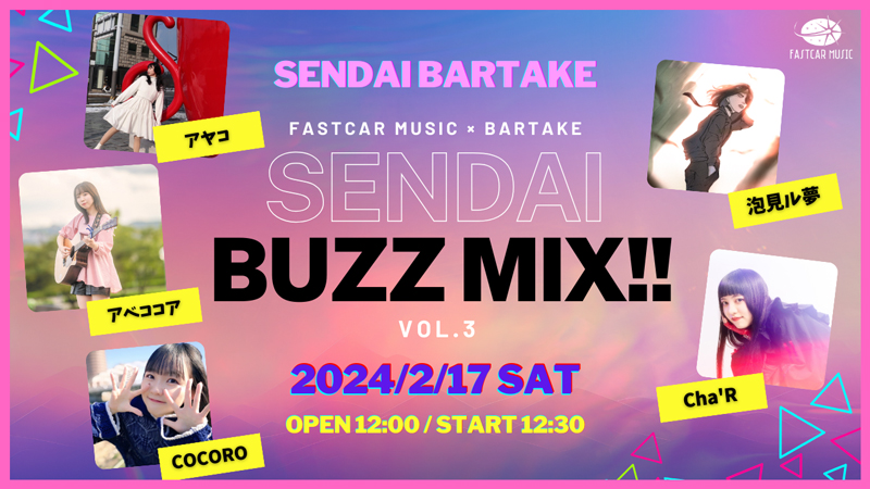 [時間] open 18:30 / start 19:00 [観覧料金] ペアチケット¥2000(+1drink別¥500) / 一般¥2000(+1drink別¥500) / 高校生以下¥1000(+1drink別¥500) [配信料金] リアルタイム視聴無料(ツイキャス) / アーカイブ視聴¥1000 [観覧予約・応援チケット] https://passmarket.yahoo.co.jp/event/show/detail/01j9x2rbq7i31.html [配信] ツイキャス https://twitcasting.tv/sendaibartake |