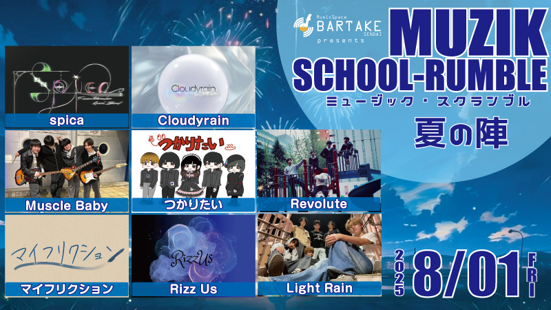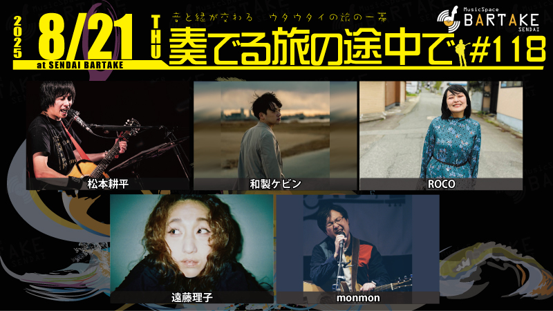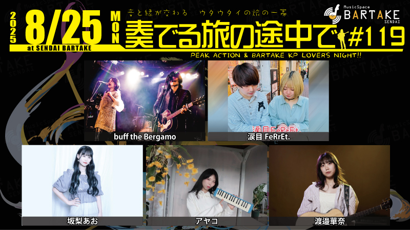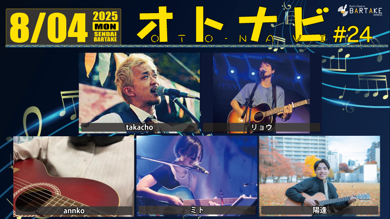 [時間] open 18:00 / start 19:00 [観覧料金] ¥3000(+1drink別¥500) [配信料金] リアルタイム視聴無料(ツイキャス) / アーカイブ視聴¥1000 [観覧予約・応援チケット] https://x.gd/bartake250827 [配信] ツイキャス https://twitcasting.tv/sendaibartake |