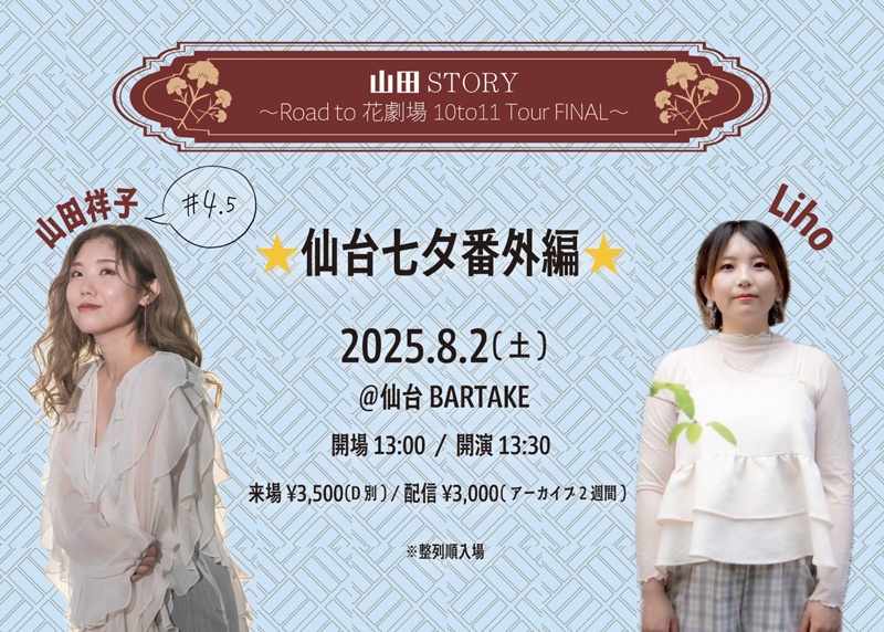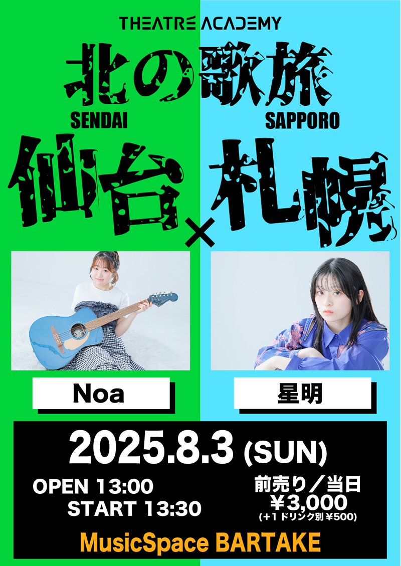 [時間] open 17:30 / start 18:00 [観覧料金] 一般¥2000(+1drink別¥500) / 高校生以下¥1000(+1drink別¥500) ※早割:アーカイブ視聴券付(公演1週間前までのWEB予約が対象です) [配信料金] リアルタイム視聴無料(ツイキャス) / アーカイブ視聴¥1000 [観覧予約・応援チケット] https://x.gd/bartake250814 [配信] ツイキャス https://twitcasting.tv/sendaibartake |
