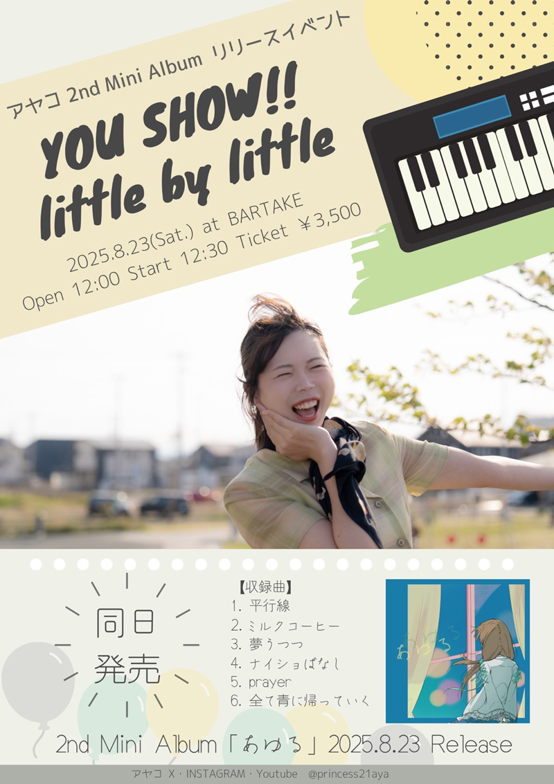 [時間] open 17:00 / start 17:30 [観覧料金] 一般¥2000(+1drink別¥500) / 高校生以下¥1000(+1drink別¥500) ※早割:公演1週間前までのWEB予約を対象に、アーカイブ視聴券付き [配信料金] リアルタイム視聴無料(YouTubeLive) [観覧予約・応援チケット] https://x.gd/bartake250817 [配信] YouTubeLive https://www.youtube.com/@MusicSpaceBARTAKE |