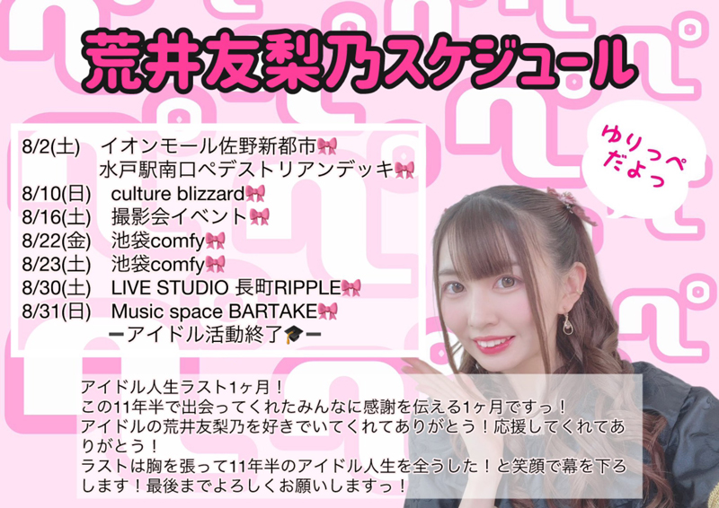 【荒井友梨乃 アイドル卒業LIVE DAY2】[1部] ■荒井友梨乃 ■Croire Grato-クログラ- ■あなたを追っていたら知らない場所に来た ■三咲はる ■月森楓 ■no concept ■ゆめいろ流星群 ■桜宮蓮 ■SistersHolic [2部] ■荒井友梨乃 ■Croire Grato-クログラ- ■あなたを追っていたら知らない場所に来た ■三咲はる ■no concept ■ゆめいろ流星群 ■桜宮蓮 ■SistersHolic ■ずんだ茜 |