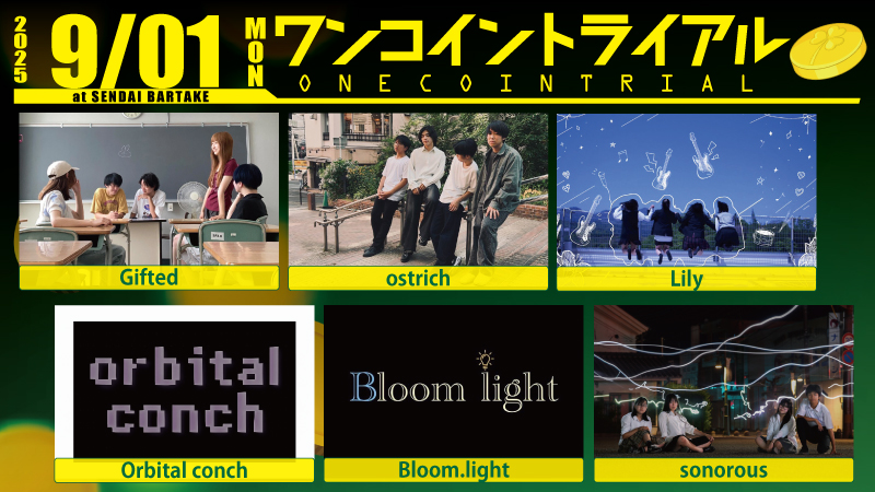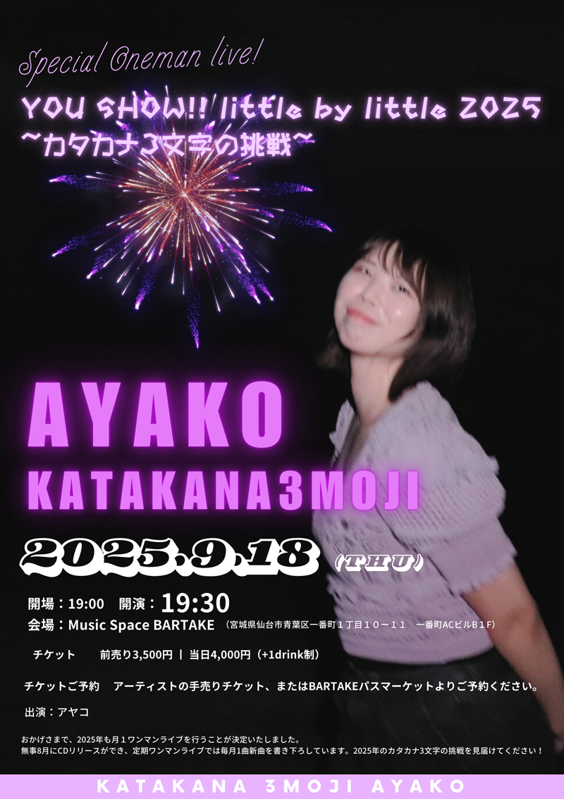 [時間] open 18:30 / start 18:50 [観覧料金] 一般¥2000(+1drink別¥500) / 高校生以下¥1000(+1drink別¥500) ※早割:アーカイブ視聴券付(公演1週間前までのWEB予約が対象です) [配信料金] リアルタイム視聴無料(ツイキャス) / アーカイブ視聴¥1000 [観覧予約・応援チケット] https://x.gd/bartake250905 [配信] ツイキャス https://twitcasting.tv/sendaibartake [アーカイブ] |