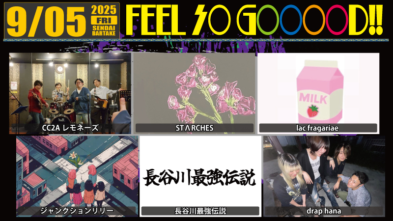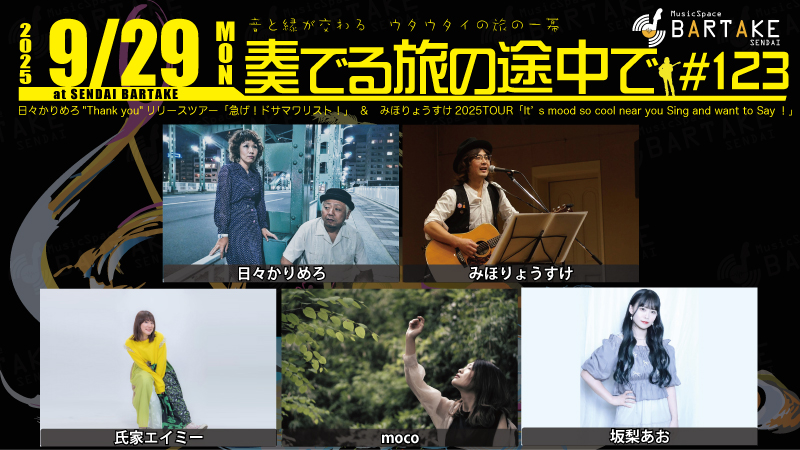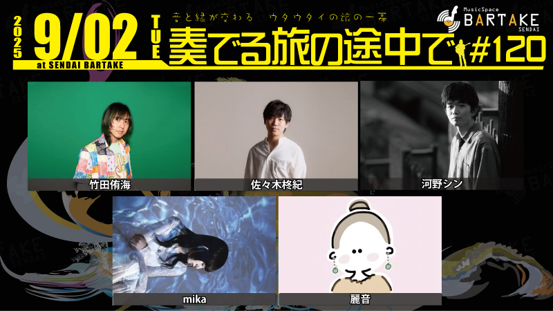 [時間] open 18:30 / start 19:00 [観覧料金] 早割¥2500(1drink付) / 一般¥2500(+1drink別¥500) / 高校生以下¥1000(+1drink別¥500) ※早割は公演1週間前までのWEB予約が対象です。 [配信料金] リアルタイム視聴無料(ツイキャス) / アーカイブ視聴¥1000 [観覧予約・応援チケット] https://x.gd/bartake250902 [配信] ツイキャス https://twitcasting.tv/sendaibartake |