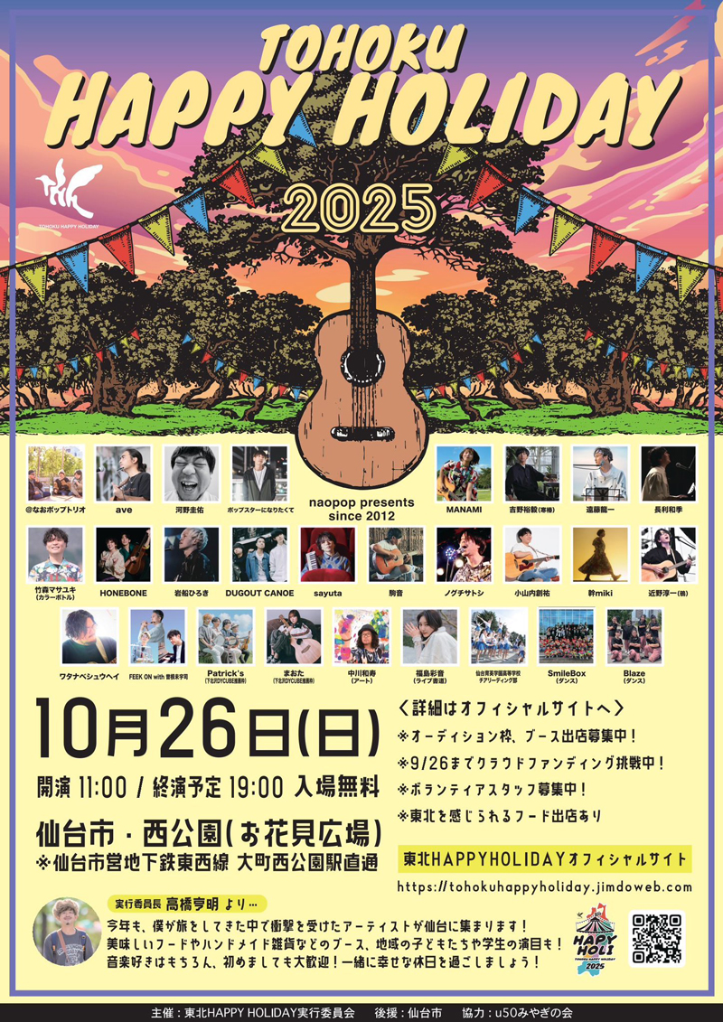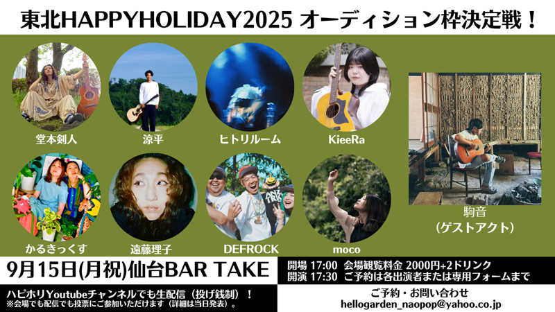 【東北HAPPY HOLIDAYオーディションライブ】10/26に開催される「東北HAPPY HOLIDAY2025」の出演枠をかけたオーディションライブ開催 [エントリーアーティスト] ■堂本剣人 ■涼平 ■ヒトリルーム ■KieeRa ■かるきっくす ■遠藤理子 ■DEFROCK ■moco [ゲストアクト] ■駒音 公式サイト:https://tohokuhappyholiday.jimdoweb.com/ |
