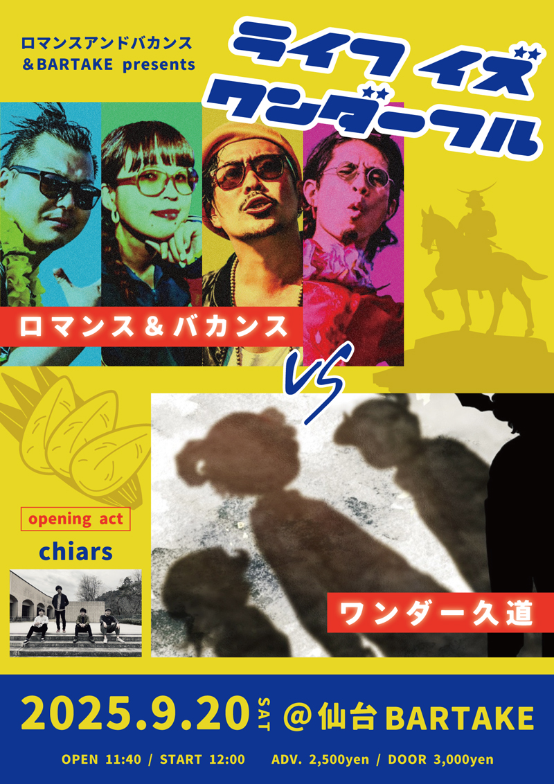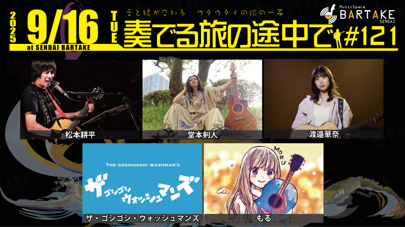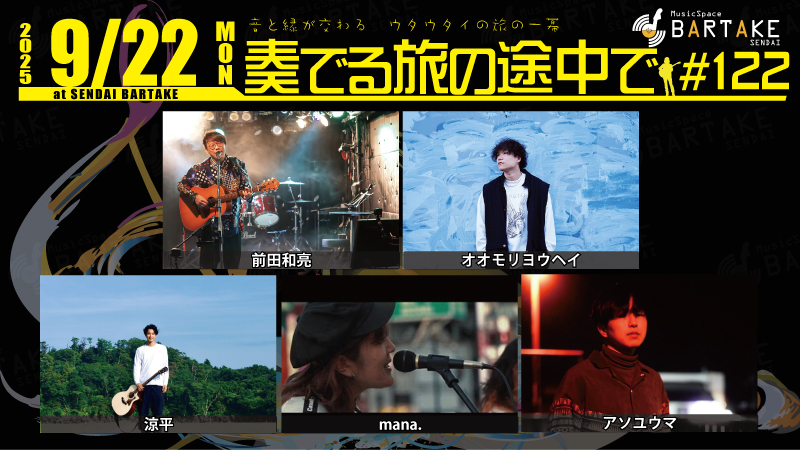 [時間] open 18:30 / start 19:00 [観覧料金] 早割¥2500(1drink付) / 一般¥2500(+1drink別¥500) / 高校生以下¥1000(+1drink別¥500) ※早割は公演1週間前までのWEB予約が対象です。 [配信料金] リアルタイム視聴無料(ツイキャス) / アーカイブ視聴¥1000 [観覧予約・応援チケット] https://x.gd/bartake250916 [配信] ツイキャス https://twitcasting.tv/sendaibartake |