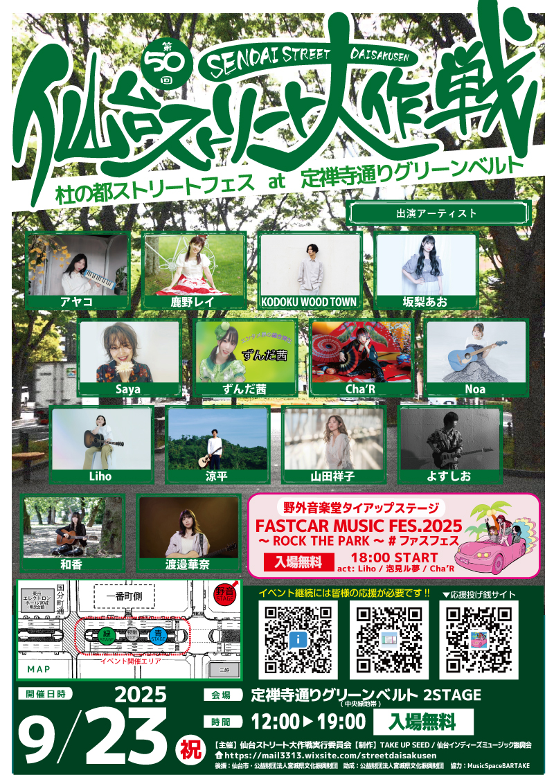 [時間] 【野外音楽堂】start 18:00~ [料金] 入場無料 [応援投げ銭] https://x.gd/fastcar250923 [問い合わせ] https://mail3313.wixsite.com/streetdaisakusen |