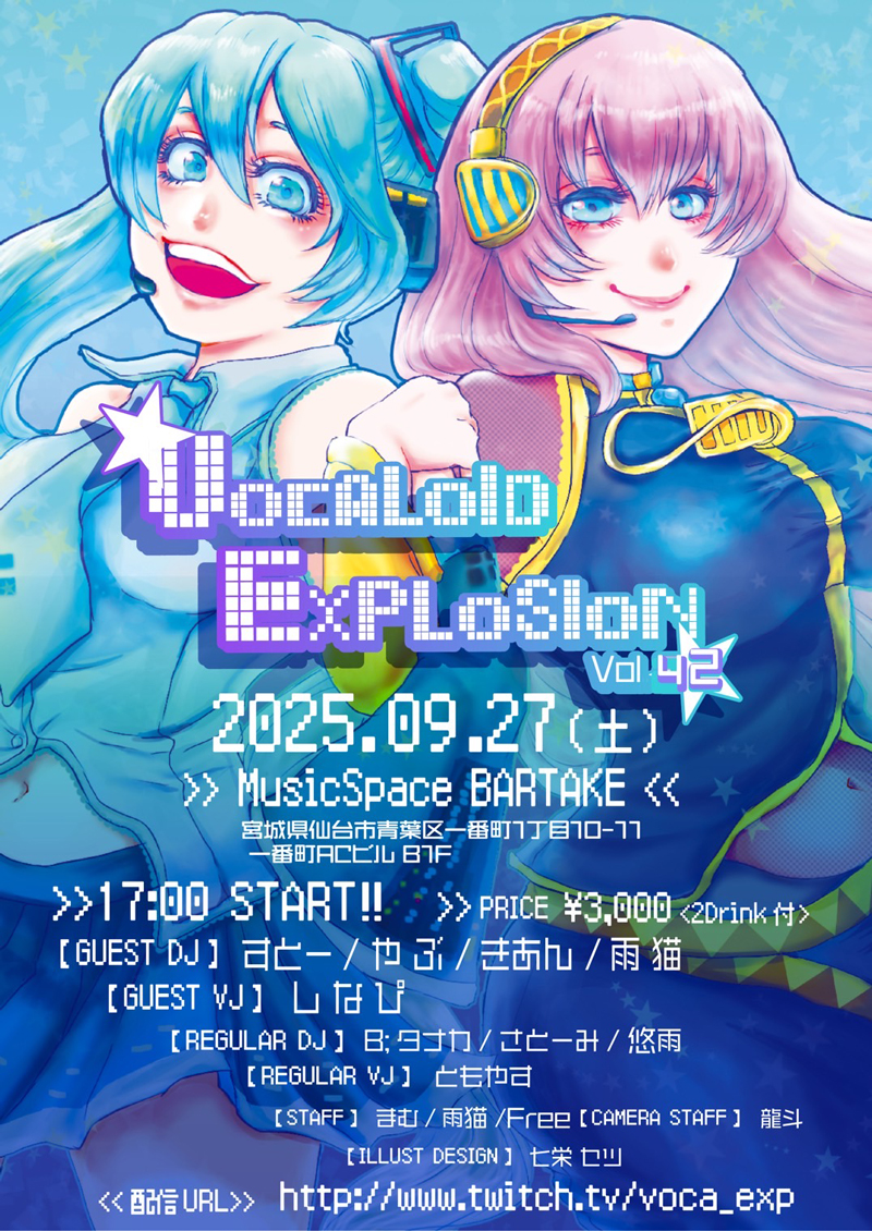 【VOCALOID EXPLOSION vol.42】[GUEST DJ] ■すとー ■やぶ ■きあん ■雨猫 [GUEST VJ] ■しなぴ [REGULAR DJ] ■B;タナカ ■さとーみ ■悠雨 [REGULAR VJ] ■ともやす [STAFF] ■まむ ■雨猫 ■Free [CAMERA STAFF] ■龍斗 [ILLUST・DESIGN] ■七栄 セツ |