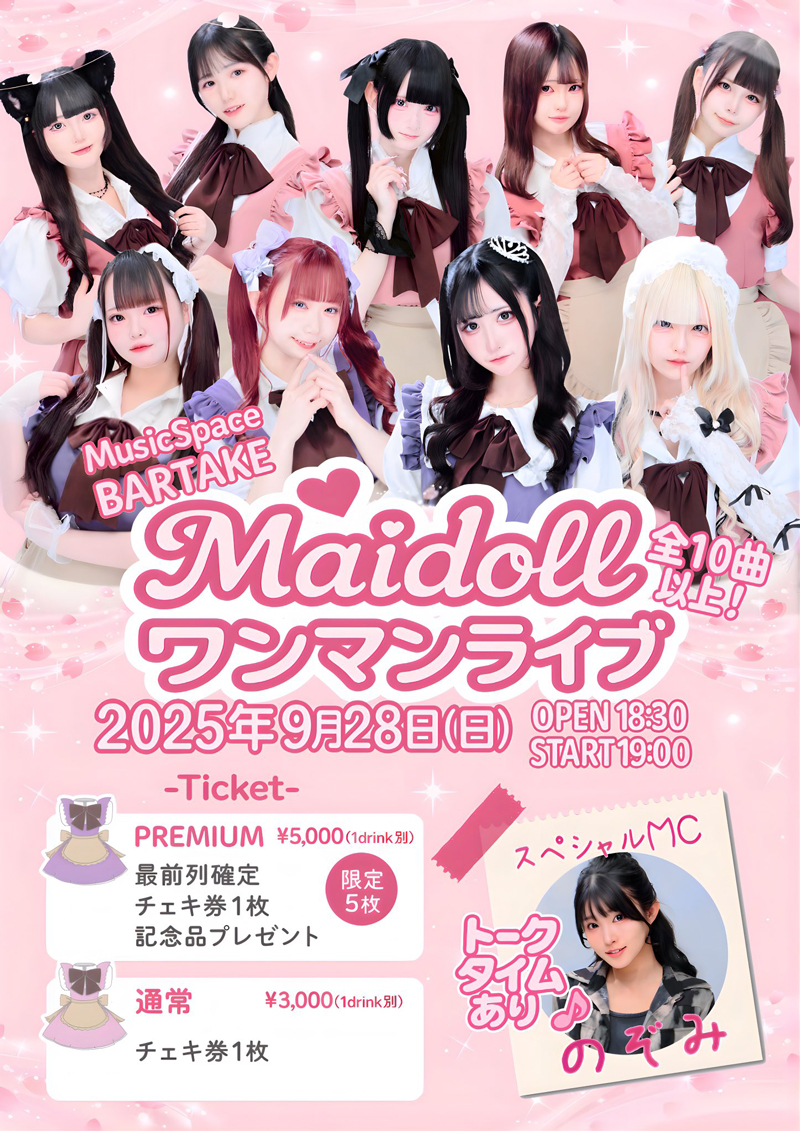 [時間] open 18:30 / start 19:00 [料金] PREMIUM¥5000(+1drink別¥500)※限定5枚 / 通常¥3000(+1drink別¥500) [チケット購入] 7/19(土)15:00よりメイドールにて、手売り開始 [問い合わせ] X https://x.com/maidoll_sendai |