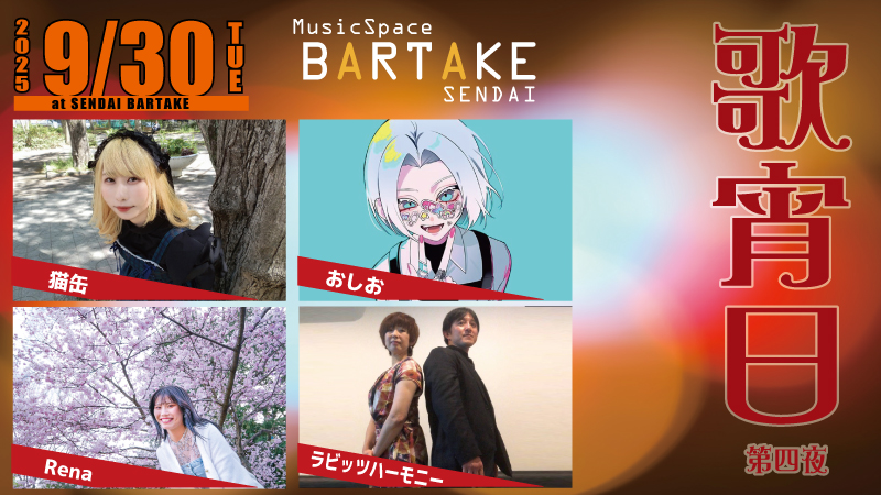[時間] open 19:00 / start 19:20 [観覧料金] 一般¥1500(+1drink別¥500) / 早割:アーカイブ視聴券付き ※早割は公演1週間前までのWEB予約が対象です。 [配信料金] リアルタイム視聴無料(ツイキャス) / アーカイブ視聴¥1000 [観覧予約・応援チケット] https://x.gd/bartake250930 [配信] ツイキャス https://twitcasting.tv/sendaibartake |