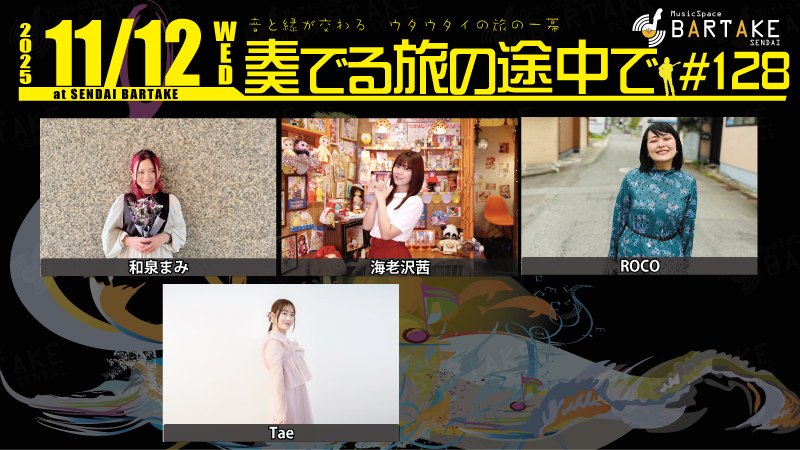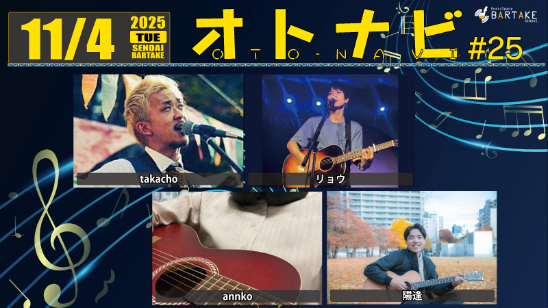 [時間] open 18:30 / start 19:00 [観覧料金] オトナビ割ペアチケット¥2000(+各1drink別¥500)2名まで入場可能 / 一般¥2000(+1drink別¥500) / 高校生以下¥1000(+1drink別¥500) ※早割は公演1週間前までのWEB予約が対象です。 [配信料金] リアルタイム視聴無料(ツイキャス) / アーカイブ視聴¥1000 [観覧予約・応援チケット] https://x.gd/bartake251104 [配信] ツイキャス https://twitcasting.tv/sendaibartake |