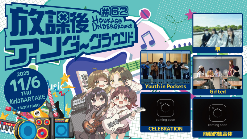 【放課後アンダーグラウンド#62】[出演] ■翠 ■Gifted ■能動的集合体 ■Youth in Pockets ■CELEBRATION |