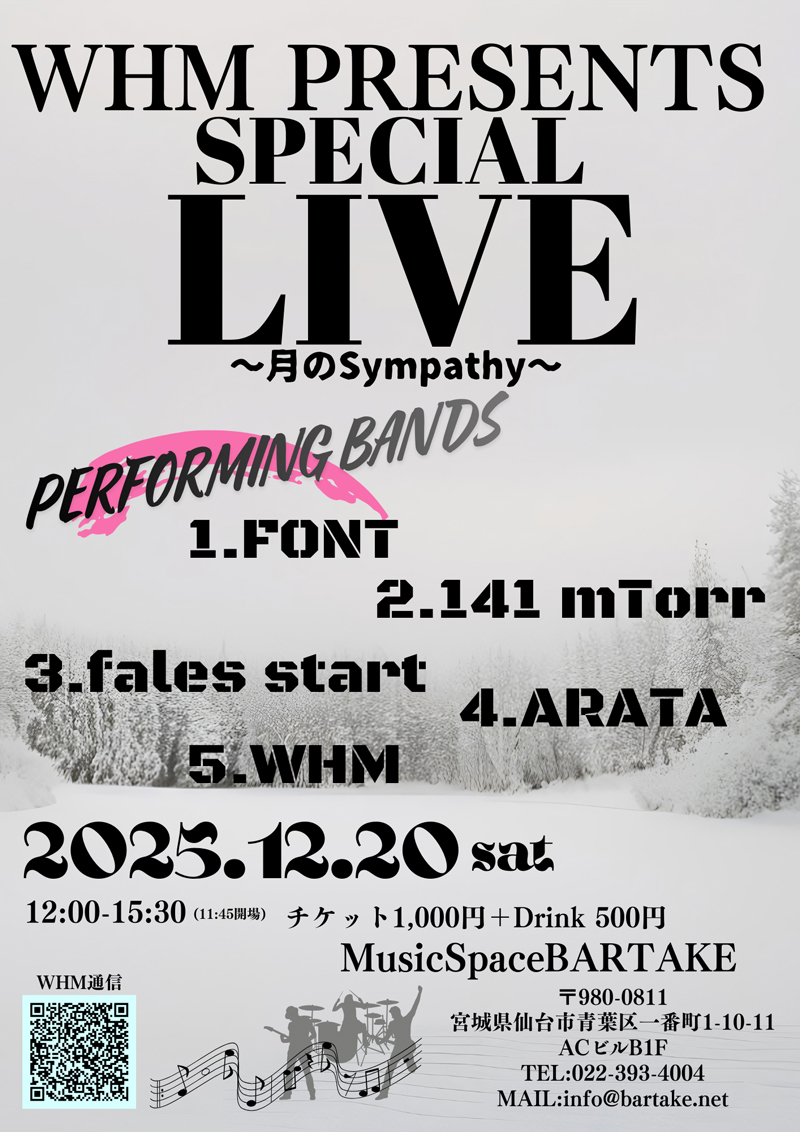 [時間] open 16:00 / start 16:30 [料金] 予約¥800(+1drink別¥500) [配信料金] 視聴無料(YouTubeLive) [観覧予約・応援チケット] https://x.gd/bartake251225 ※11/10(月)20:00-予約受付開始(枚数限定) 当日券や取り置き等での来場はできません。 [配信] YouTubeLive https://www.youtube.com/@MusicSpaceBARTAKE ※お電話での対応はできませんのでご了承ください。 |