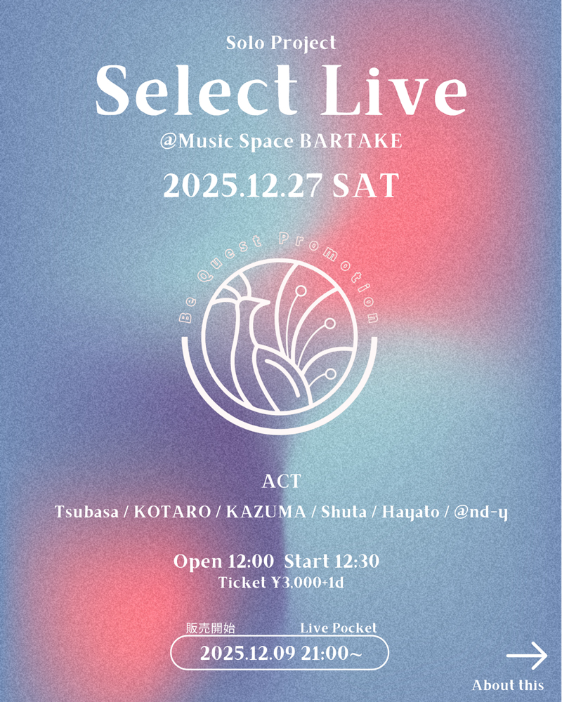 【= Solo Project = 「Select Live」】[出演] ■Tsubasa ■KOTARO ■KAZUMA ■Shuta ■Hayato ■@nd-y |