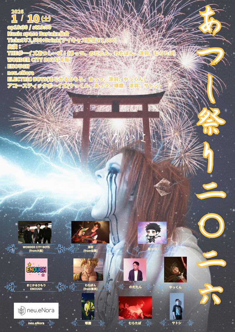 [時間] open 18:30 / start 19:00 [観覧料金] 一般¥2500(+1drink別¥500) [配信料金] ツイキャスプレミア¥1000 [観覧予約・応援チケット] https://x.gd/bartake260110 [配信チケット] ツイキャスプレミア https://premier.twitcasting.tv/sendaibartake/shopcart/407746 |