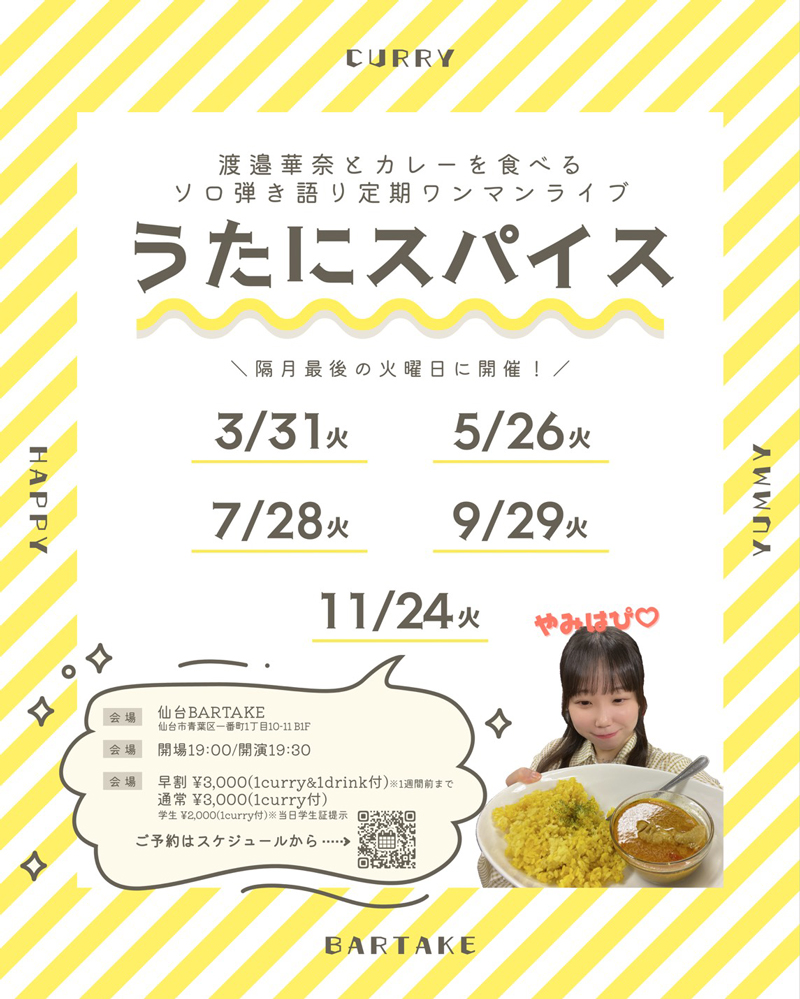 [時間] open 19:00 / start 19:30 [観覧料金] 早割¥3000(1curry&1drink付) / 一般¥3000(1drink付) / 学割¥2000 ※早割は公演1週間前までの事前購入が対象です。 [配信料金] リアルタイム視聴無料(ツイキャス) [観覧予約・応援チケット] https://x.gd/bartake260526 [配信] ツイキャス https://twitcasting.tv/sendaibartake |
