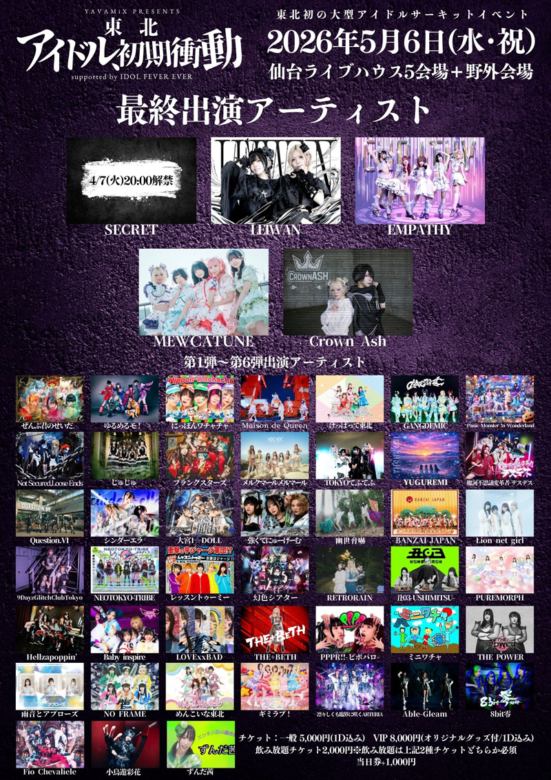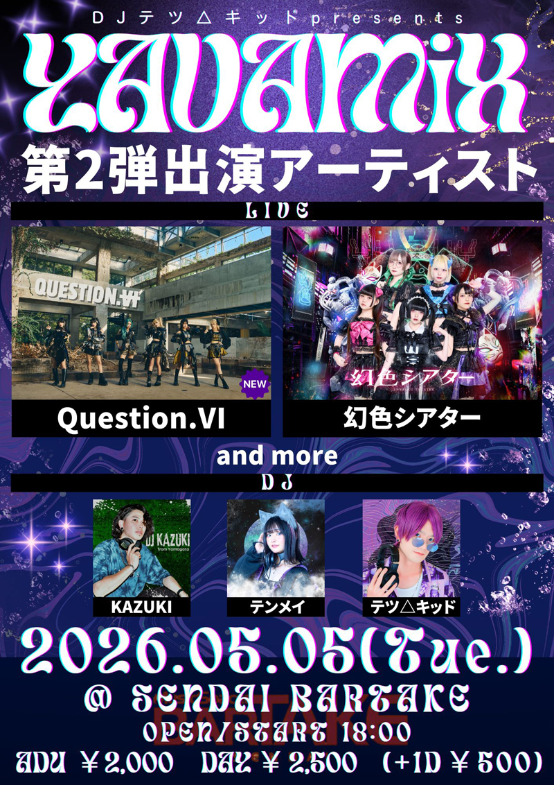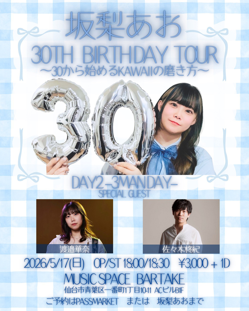 [時間] open 18:00 / start 18:30 [観覧料金] 予約¥3000(+1drink別¥500) [配信料金] リアルタイム視聴無料(ツイキャス) / アーカイブ視聴¥1000 [観覧予約・応援チケット] https://x.gd/kawaii260517 [配信] ツイキャス https://twitcasting.tv/sendaibartake |