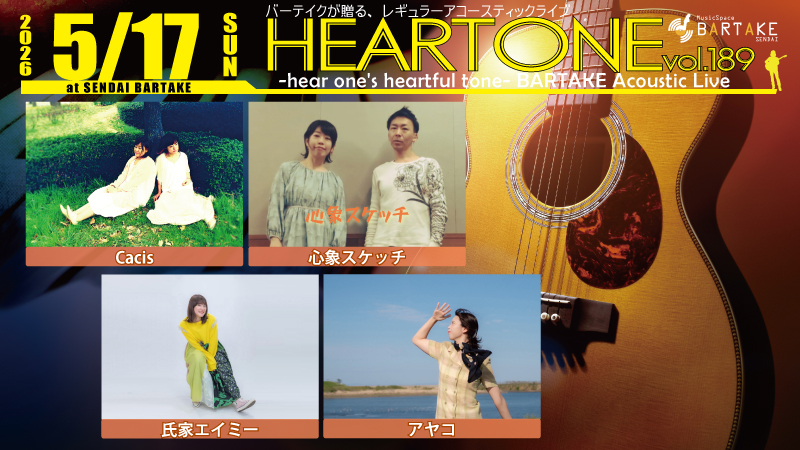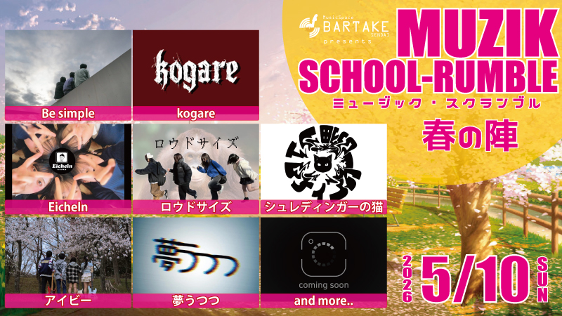 [時間] open 11:30 / start 11:50 [観覧料金] 一般¥2500(+1drink別¥500) / 高校生以下¥1000(+1drink別¥500) WEB早割:アーカイブ視聴券付き(1週間前までのWEB予約分対象) [配信料金] リアルタイム視聴無料(ツイキャス) / アーカイブ視聴¥1000 [観覧予約・応援チケット] https://x.gd/bartake260517 [配信] ツイキャス https://twitcasting.tv/sendaibartake |